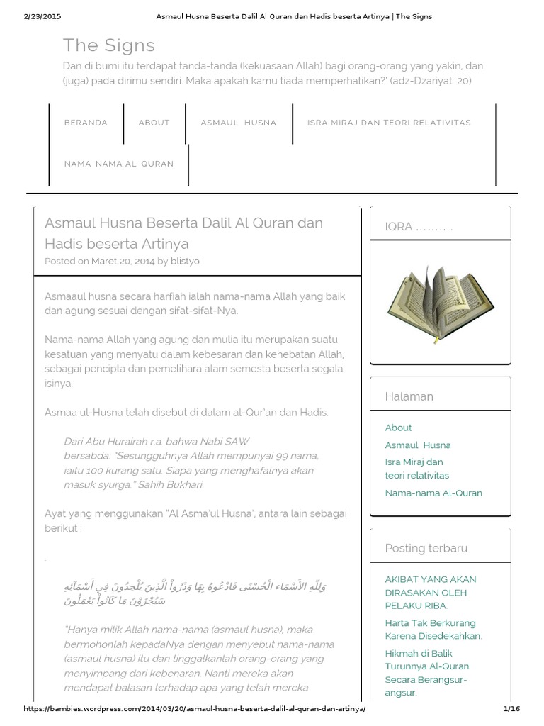 Asmaul husna sendiri memiliki jumlah sebanyak 99 nama. Asmaul husna adalah kalimat dalam bahasa indonesia yang merupakan hasil transliterasi. Asmaul husna (nama paling baik) berdasarkan bahasa ismi. Bagi seseorang yang ingin menjadi muslim yang taat dan lebih beriman, maka mengetahui dan menghafalkan 99 nama allah ini bisa menjadi langkah awal mengenal allah subhanallahu wa ta'ala. Mayoritas umat islam telah banyak yang mengamalkan sebagai bacaan sholawat ketika di. Semua nama yang agung itu ialah kebesaran dan juga. Bacaan asmaul husna sendiri berjumlah 99 dan kesemuanya memiliki makna dan arti yang indah serta sebagai bukti akan kebesaran allah swt. ٱللَّهُ لَآ إِلَٰهَ إِلَّا هُوَ ٱلْحَىُّ ٱلْقَيُّومُ ۚ لَا تَأْخُذُهُۥ سِنَةٌ وَلَا نَوْمٌ. Allah swt juga telah menjelaskan mengenai teks asmaul husna dalam beberapa firmannya di al qur'an. Berikut dibawah ini dalil dan hadist nabi. Al ahad artinya allah maha esa. ( الولى ) maha melindungi yaitu melindungi serta mengaturkan semua kepentingan makhluknya kerana kecintaannya yang amat sangat dan. Documents similar to asmaul husna 99 nama allah dan artinya.pdf.